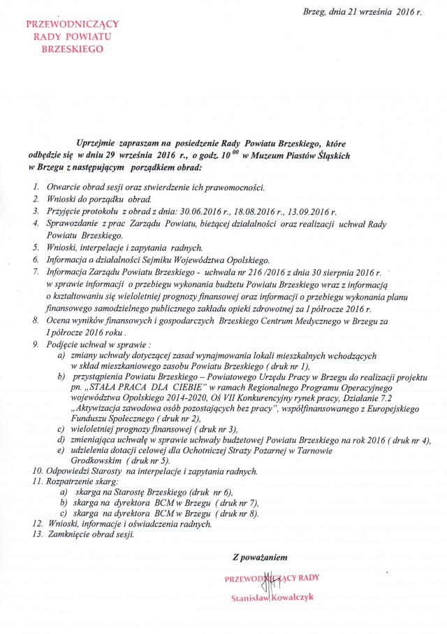Uprzejmie zapraszamy na posiedzenie Rady Powiatu Brzeskiego, które odbędzie się w dniu 29 września 2016 roku o godzinie 10.00 w Muzeum Piastów Śląskich. W programie obrad m.in.: informacja o przebiegu wykonania budżetu Powiatu Brzeskiego wraz z informacją o kształtowaniu się wieloletniej prognozy finansowej; a także ocena wyników finansowych i gospodarczych Brzeskiego Centrum Medycznego za I…