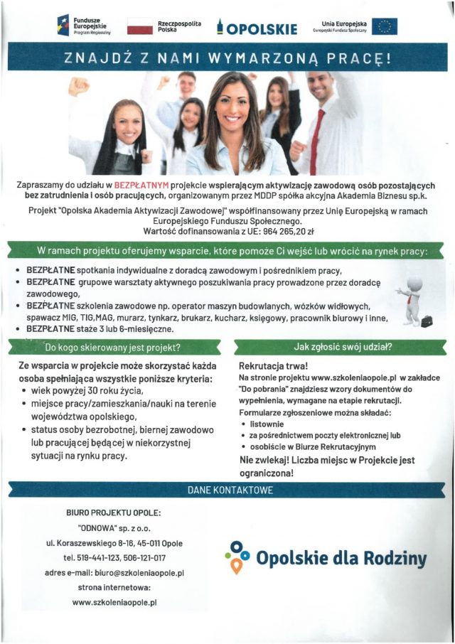 Wojewódzki Urząd Pracy w Opolu organizuje projekt na terenie województwa opolskiego wspierającego aktywizację zawodową osób pozostających bez zatrudnienia, i osób pracujących, pod tytułem ” Opolska Akademia Aktywizacji Zawodowej”.