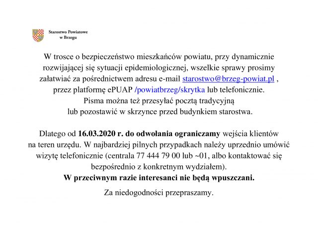 W związku z sytuacją epidemiczną panującą w Polsce i na świecie oraz w nawiązaniu do ustawy z dnia 2 marca 2020 r. o szczególnych rozwiązaniach związanych z zapobieganiem, przeciwdziałaniem i zwalczeniem COVID-19, innych chorób zakaźnych oraz wywołanych nimi sytuacji kryzysowych Starostwo Powiatowe w Brzegu informuje, że od 16 marca 2020 r. do odwołania, funkcjonowanie…