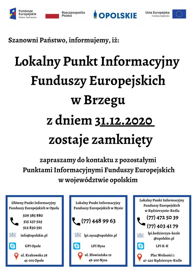 Lokalny Punkt Informacyjny Funduszy Europejskich w Brzegu zamknięty 2020-12-28Leave a commentAktualnościDodane przez Maciej Stępień