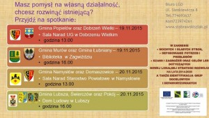Już wkrótce środki z LEADERA na Twoje pomysły w Stobrawskim Zielonym Szlaku. Jadwiga Kulczycka Prezes LGD Stobrawski Zielony Szlak zaprasza mieszkańców gminy Lubsza oraz osoby prowadzące lub planujące rozpoczęcie działalności gospodarczej na terenie gminy Lubsza do udziału w spotkaniach. Chcesz poznać możliwości ich pozyskania- przyjdz na spotkania w dniach 19 i 20 listopada. Już dzisiaj zaplanuj harmonogram…
