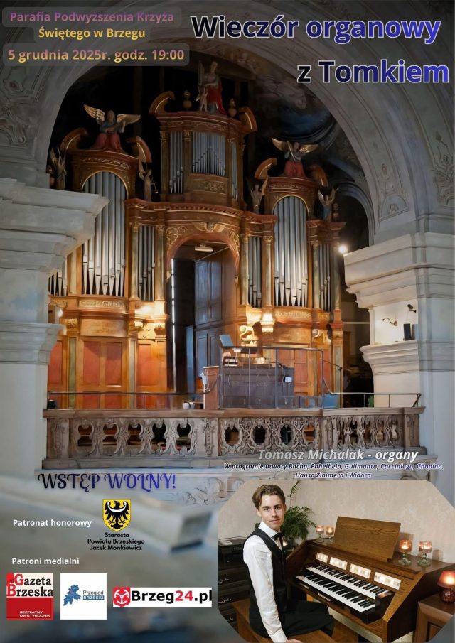 Wspólnie z Parafią pw. Podwyższenia Krzyża Świętego w Brzegu zapraszamy na koncert pt. “Wieczór organowy z Tomkiem”, na którym wystąpi młody muzyk z Brzegu Tomasz Michalak! Koncert odbędzie się 5 grudnia 2025 roku o godzinie 19:00 w kościele pw. Podwyższenia Krzyża Świętego w Brzegu. Podczas tego niezwykłego wydarzenia będzie możliwość doświadczenia potęgi i subtelności organów…