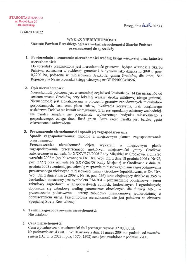 Brzeg, dnia 18 września 2023 r. G.6840.1.2.2022 Starosta Brzeski ogłasza rokowania na sprzedaż nieruchomości Skarbu Państwa Oznaczenie nieruchomości według księgi wieczystej oraz katastru nieruchomości; powierzchnia nieruchomości: Zabudowana nieruchomość stanowiąca własność Skarbu Państwa, położona w Brzegu, obręb Południe, ark. m. 13, oznaczona w ewidencji gruntów i budynków jako działka nr 551/7 o powierzchni 0,1151 ha,…