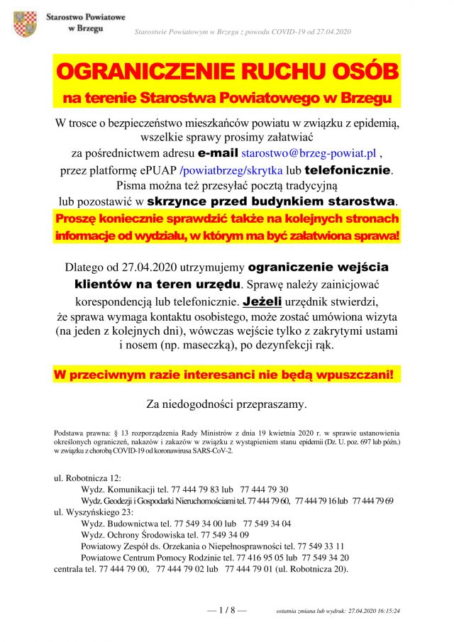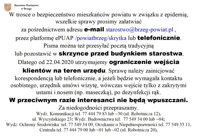 Brzeg, dnia 6.05.2020 r. G.6845.2. 8.2020 WYKAZ NIERUCHOMOŚCI Zarząd Powiatu Brzeskiego ogłasza wykaz nieruchomości przeznaczonych do oddania w najem 1. Położenie nieruchomości – Brzeg, ul. Kardynała Wyszyńskiego 23 2. Opis nieruchomości : Do wynajęcia przeznaczone jest lokal użytkowy – pomieszczenie nr 09 o pow. 19,37 m2, położone na parterze budynku przy ul. Kardynała Stefana Wyszyńskiego…