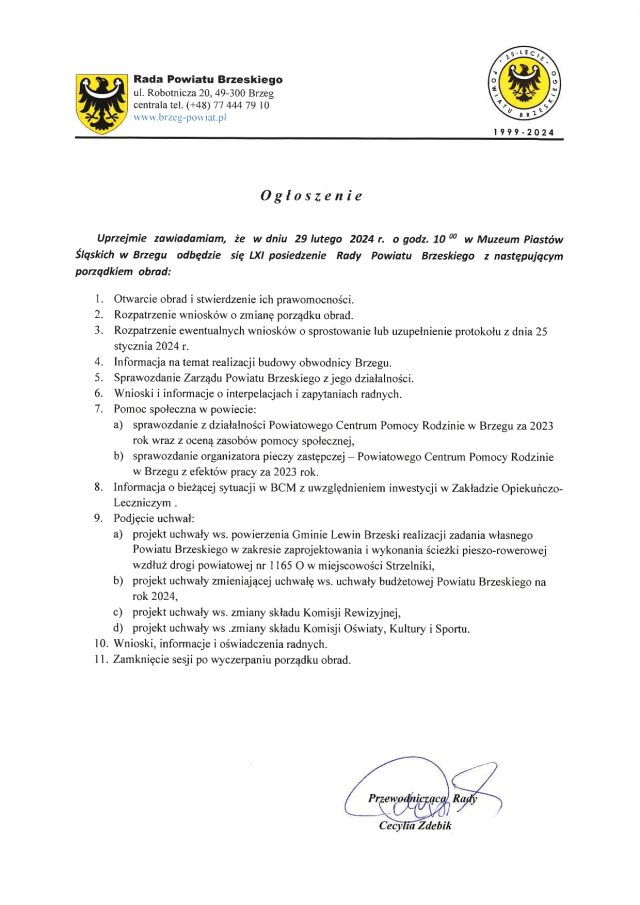 Brzeg, dnia 06.03.2024 r. Ogłoszenie o wyborze ofert Zarząd Powiatu Brzeskiego informuje, że został rozstrzygnięty otwarty konkurs ofert na rok 2024 na realizację zadań publicznych przez organizacje pozarządowe oraz inne podmioty wymienione w art. 3 ust. 3 ustawy z dnia 24 kwietnia 2003 r. o działalności pożytku publicznego i o wolontariacie (Dz. U. z 2023…