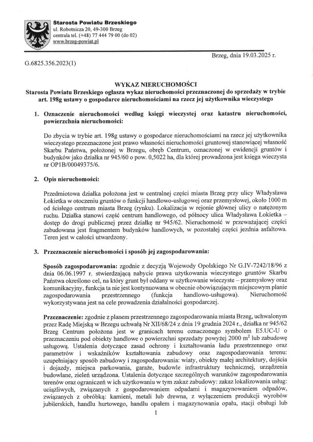 Brzeg, dnia 1.07.2025 r. G.6825.80.2024 WYKAZ NIERUCHOMOŚCI Starosta Powiatu Brzeskiego ogłasza wykaz nieruchomości przeznaczonej do sprzedaży w trybie art. 198g ustawy o gospodarce nieruchomościami na rzecz jej użytkownika wieczystego Oznaczenie nieruchomości według księgi wieczystej oraz katastru nieruchomości, powierzchnia nieruchomości: Do zbycia w trybie art. 198g ustawy o gospodarce nieruchomościami na rzecz…