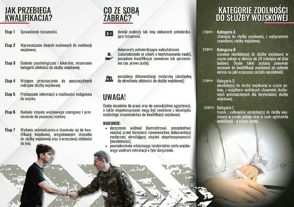 Osoby stawiające się na kwalifikację zobowiązane są przedstawić określone dokumenty. Więcej informacji na poniższej ulotce.