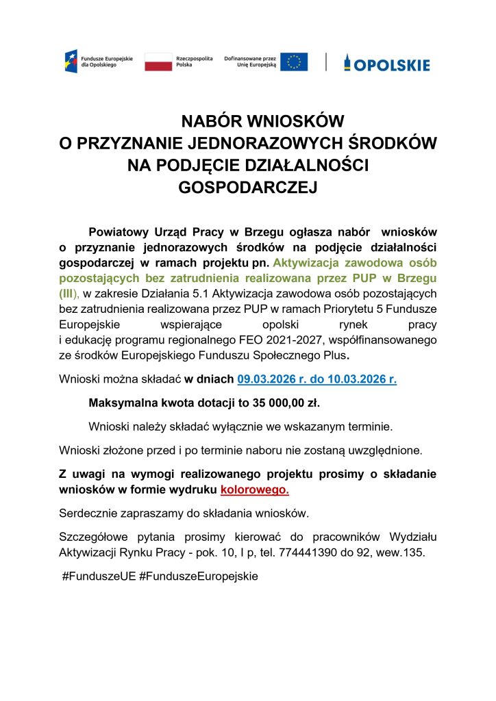 Nabór wniosków o przyznanie jednorazowych środków na podjęcie działalności gospodarczej w ramach projektu pn. Aktywizacja zawodowa osób pozostających bez zatrudnienia realizowana przez PUP w Brzegu (III)