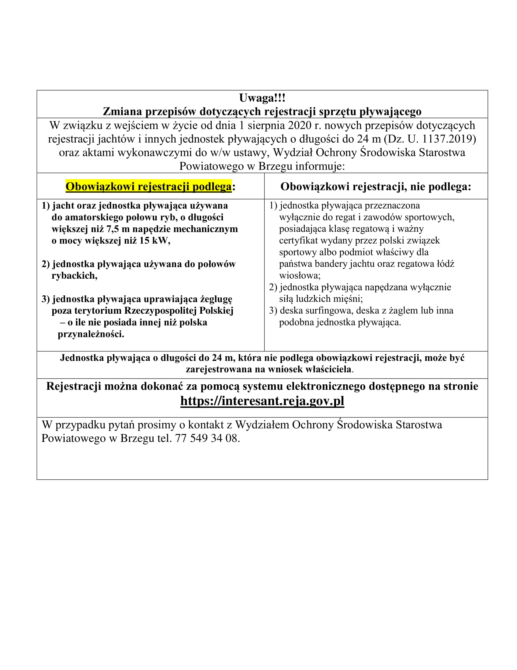 Wydział Ochrony Środowiska Starostwa Powiatowego w Brzegu informuje, że w dniu 1 sierpnia 2020 r weszła w życie ustawa z dnia 12 kwietnia 2018 r. o rejestracji jachtów i innych jednostek pływających o długości do 24 m (Dz. U. z 2018 r., poz. 1137 z późn. zm.).