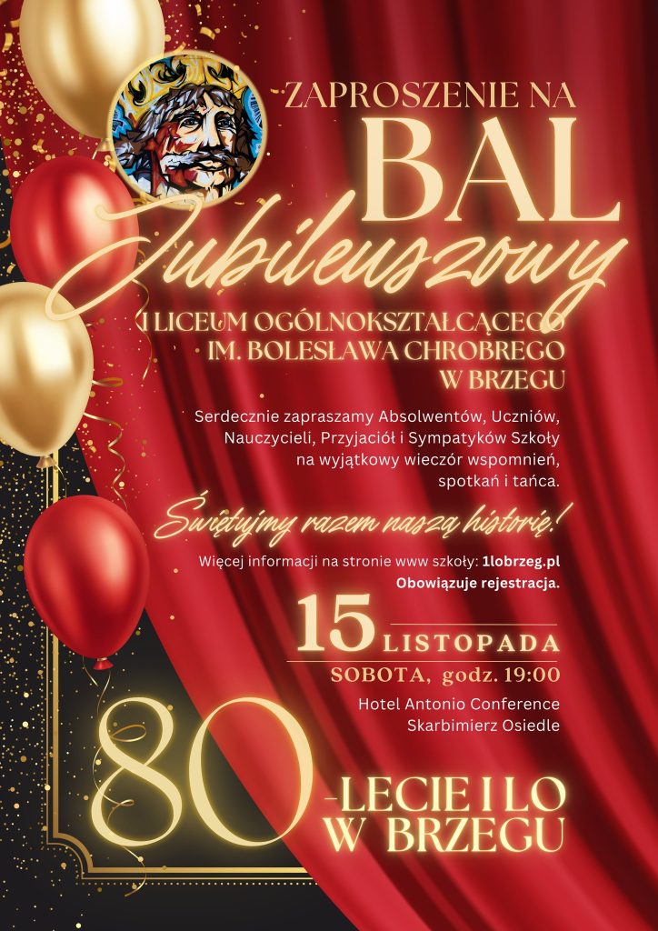 W imieniu organizatorów serdecznie zapraszamy na Bal Jubileuszowy z okazji 80-lecia I Liceum Ogólnokształcącego im. Bolesława Chrobrego w Brzegu, który odbędzie się 15 listopada 2025 r.