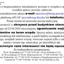 W trosce o bezpieczeństwo mieszkańców powiatu w związku z epidemią, wszelkie sprawy prosimy załatwiać za pośrednictwem adresu e-mail starostwo@brzeg-powiat.pl , przez platformę ePUAP /powiatbrzeg/skrytka lub telefonicznie. Pisma można też przesyłać pocztą tradycyjną lub pozostawić w skrzynce przed budynkiem starostwa. Dlatego od 22.04.2020 utrzymujemy ograniczenie wejścia klientów na teren urzędu. Sprawę należy zainicjować korespondencją lub telefonicznie,…